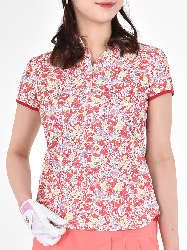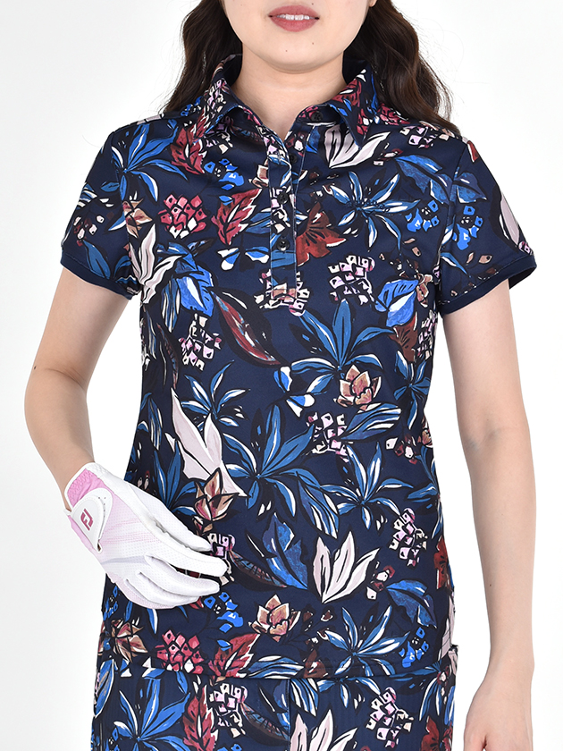 大きな柄でも大人っぽい配色で派手になりすぎない上品な佇まいのシャツに仕上がりました。盛夏のシーズンに嬉しい吸汗速乾機能とUPF15効果を備えています。袖口を無地で切り替えて引き締まった印象にしました。リゾートテイストなデザインなのでゴルフをはじめ、レジャーやアウトドア、旅行などでも活躍します。程よく身体にフィットしたナチュラルなシルエットで裾をインしてもアウトでラフに着崩しても綺麗に着こなせるのが特徴的なシャツです。同柄のスカート(241-1128813)とのセットアップコーディネートも楽しめます。