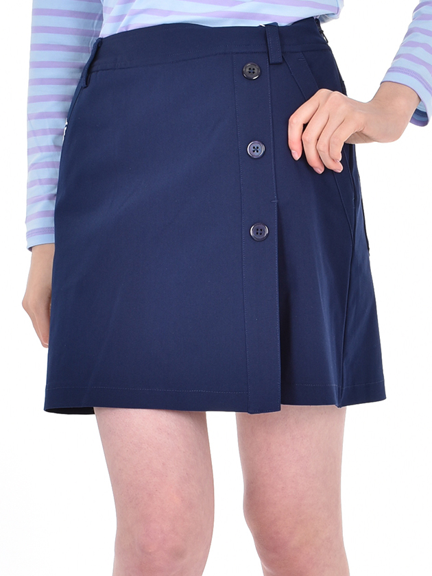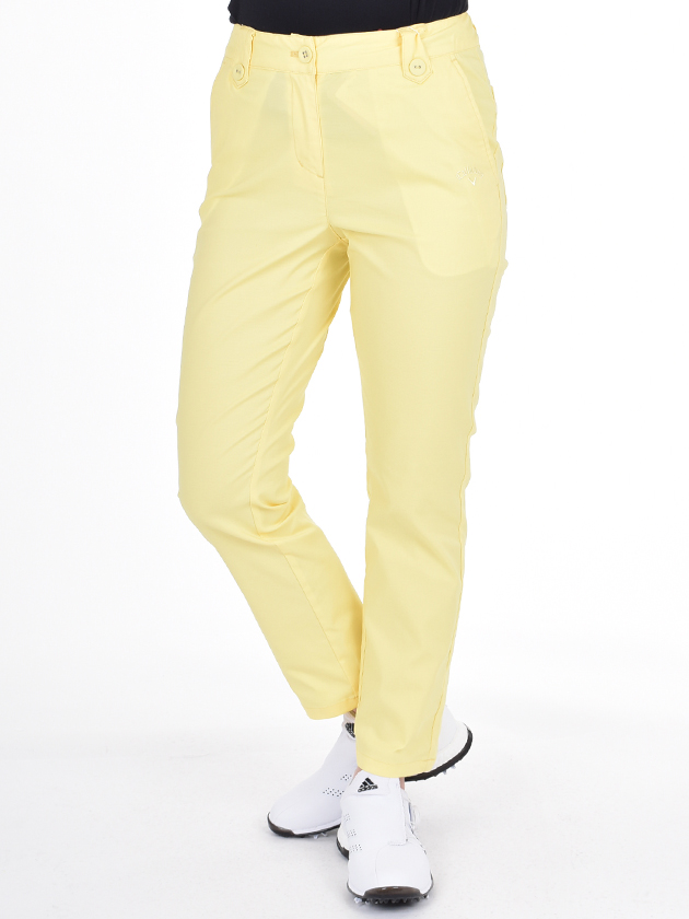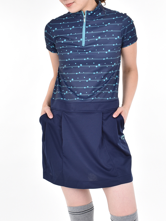 上品な表情で総柄でも落ち着いた印象に。ウエストはゴム入りでラクな着心地。吸汗速乾、UPF15のある生地で快適に着用できます。